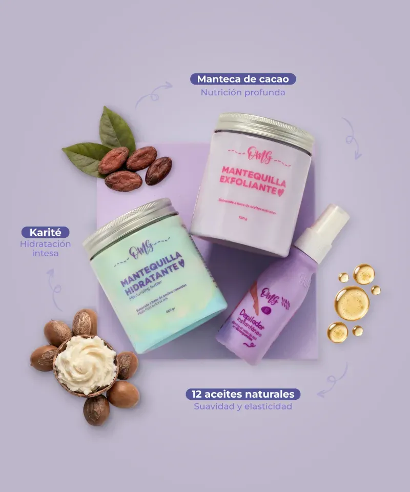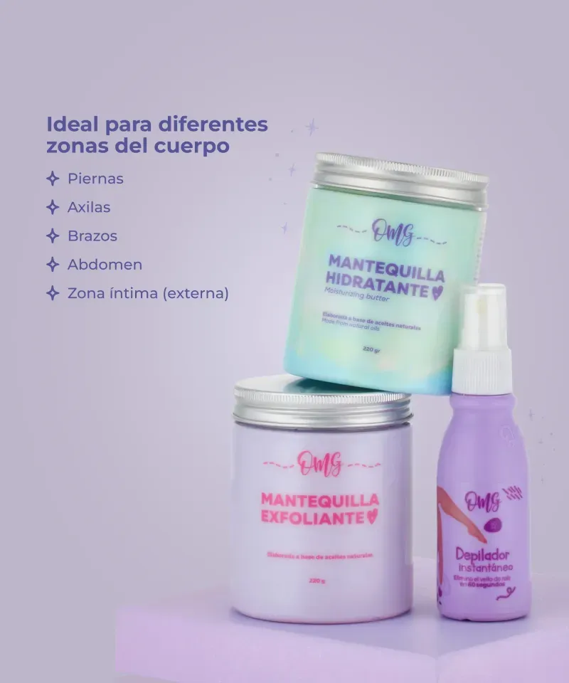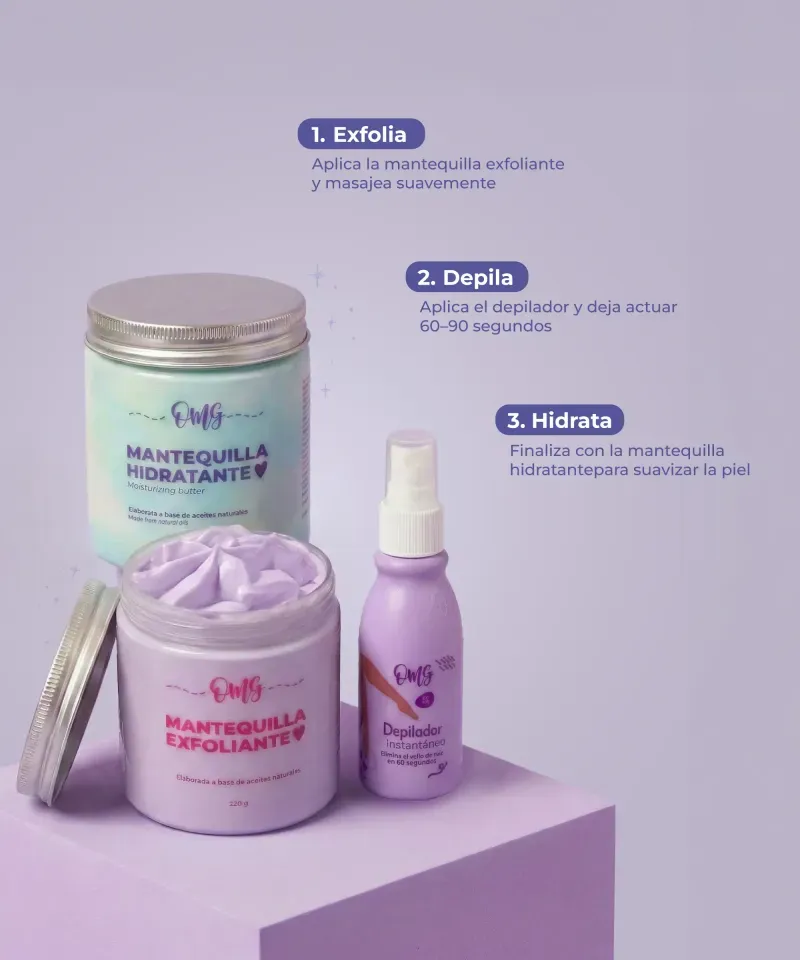 Contains: Epilator Spray 60 ml, Moisturizing Body Butter 220 grams and Exfoliating Body Butter 220 grams